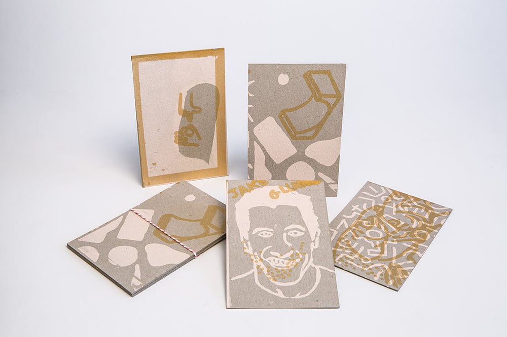 Lot de 4 cartes sérigraphiées, en rose et doré sur carton gris. 16 lots. Jake / Fuck / Fish / Skate